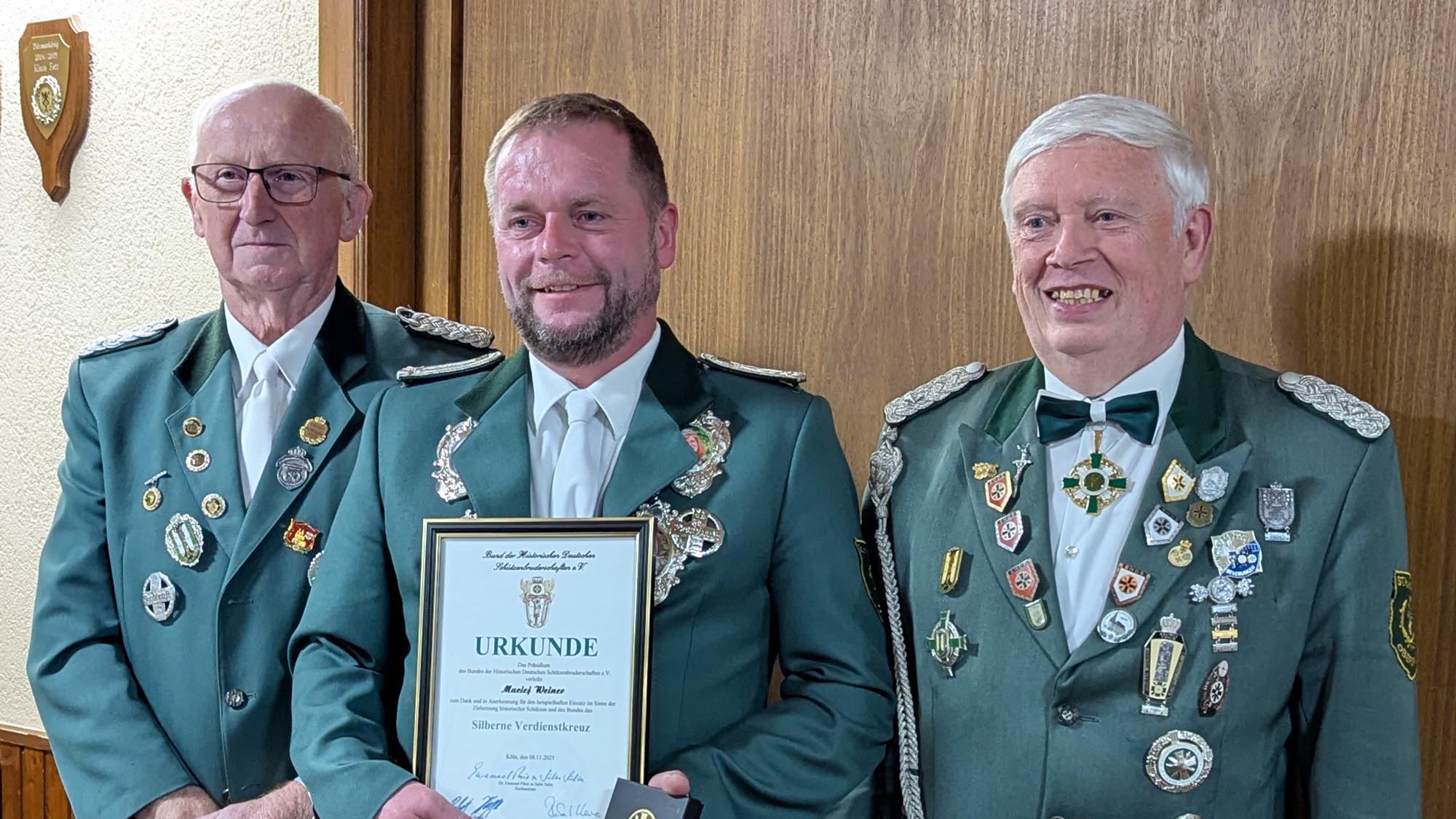 Foto Irene Tuschen: Ausgezeichneter Maciej Weiner eingerahmt vom Stv. Brudermeister und Adjutant Heinz-Hubert Marquardt und Brudermeister Manfred von Goscinski, sen.