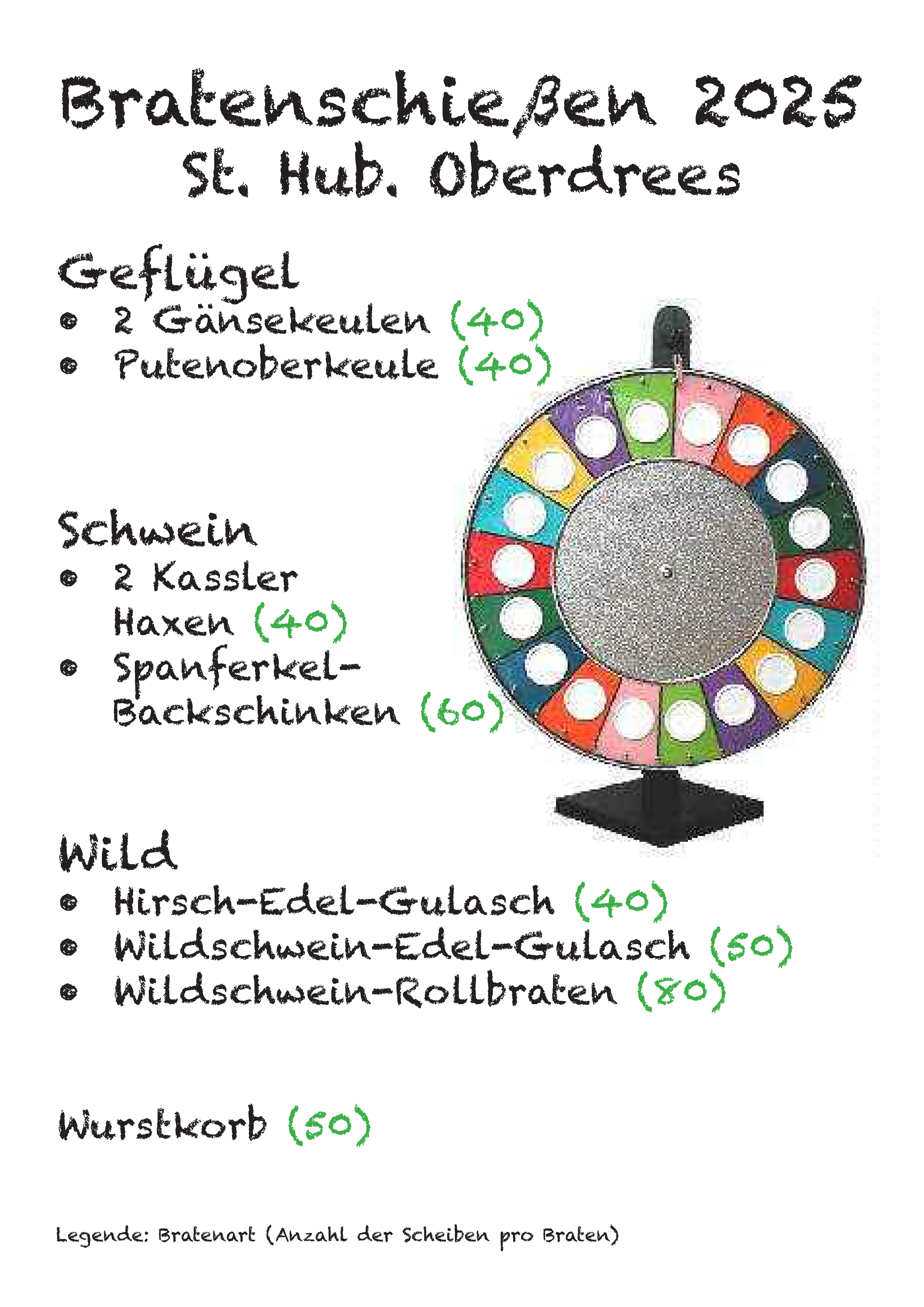 Dorfpokal & Bratenschießen Dorfpokal & Bratenschießen 2025 Weiterlesen Bratenschießen 2025 - 25 "Braten" ausgeschossen Weiterlesen Dorfpokalschießen 2025 - Ergebnisse Glücksschießen Weiterlesen Dorfpokalschießen 2025 - Ergebnisse Offene Klasse Weiterlesen Dorfpokalschießen 2025 - Ergebnisse Sonderklasse Weiterlesen Dorfpokalschießen 2024 - Sieger Weiterlesen Dorfpokal 2013 - WDR Lokalzeit zu Gast Der WDR war am 16.10.2013 live zu Gast beim Oberdreeser Dorfpokal und Weihnachtsbratenschießen! Mebby hat uns das Video zur Verfügung… Weiterlesen
