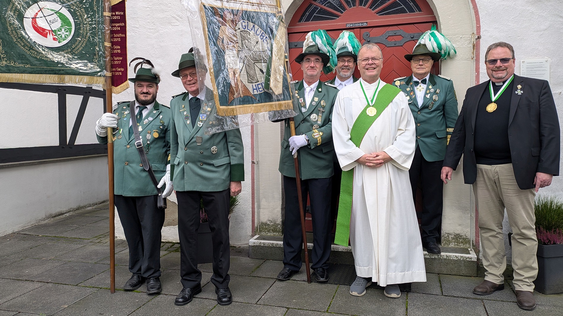 Zu Beginn des Bezirksfestes zeichnete Walter Honerbach nach der gut besuchten Andacht in der Oberdreeser St. Ägidius Kirche den Bezirkspräses Diakon Wolfgang Kader für seinen 25-jährigen Einsatz mit dem St. Sebastianus Ehrenschild für Präsides aus.